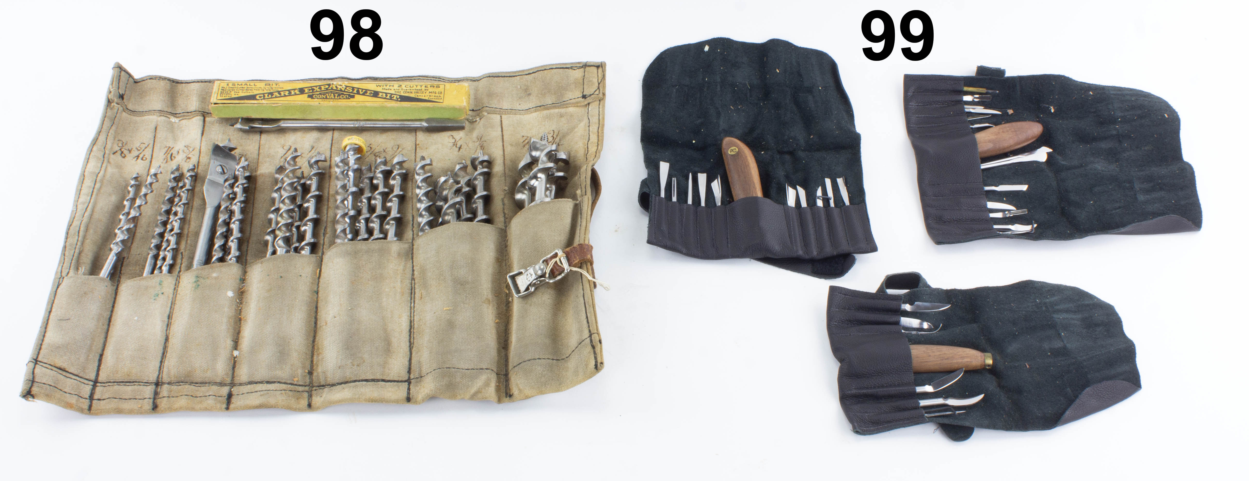 7502-99 Lot of three multitools. Each with wooden handle and various blades and attachments, inside individual black leather pouches. Unmarked and like new condition. Fine (KLY034) 75-150