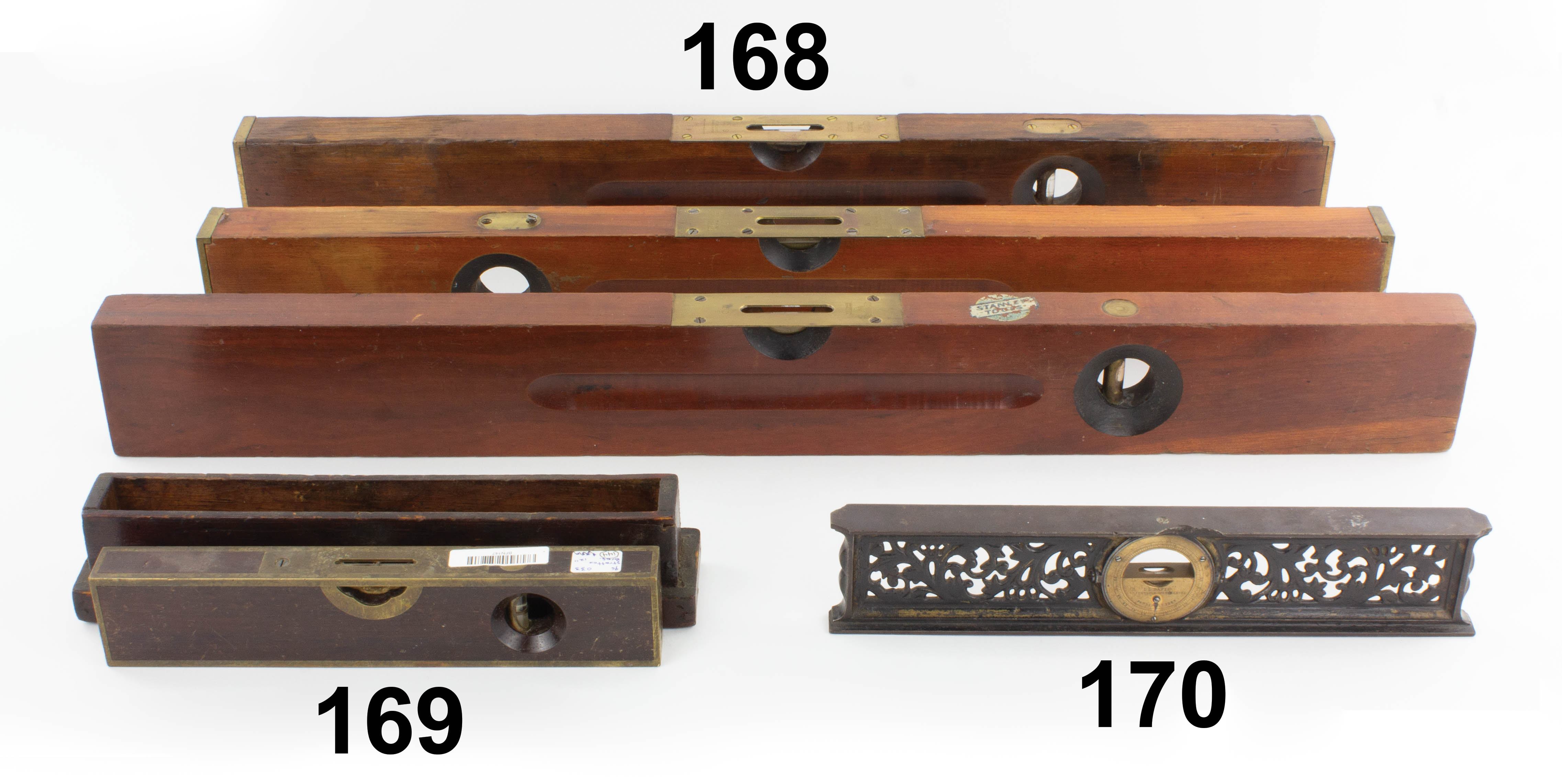 7502-168 Lot of three STANLEY wooden carpenter levels. Two 26" No. 3s; one with sweetheart mark; one with vee mark. Sweetheart has significant wear on stock. Other has one missing screw on plumb vial cover and missing plumb vial. Plus a 28" No. 0 with sweetheart mark and partial decal. Good&Better (BLY076) 50-100