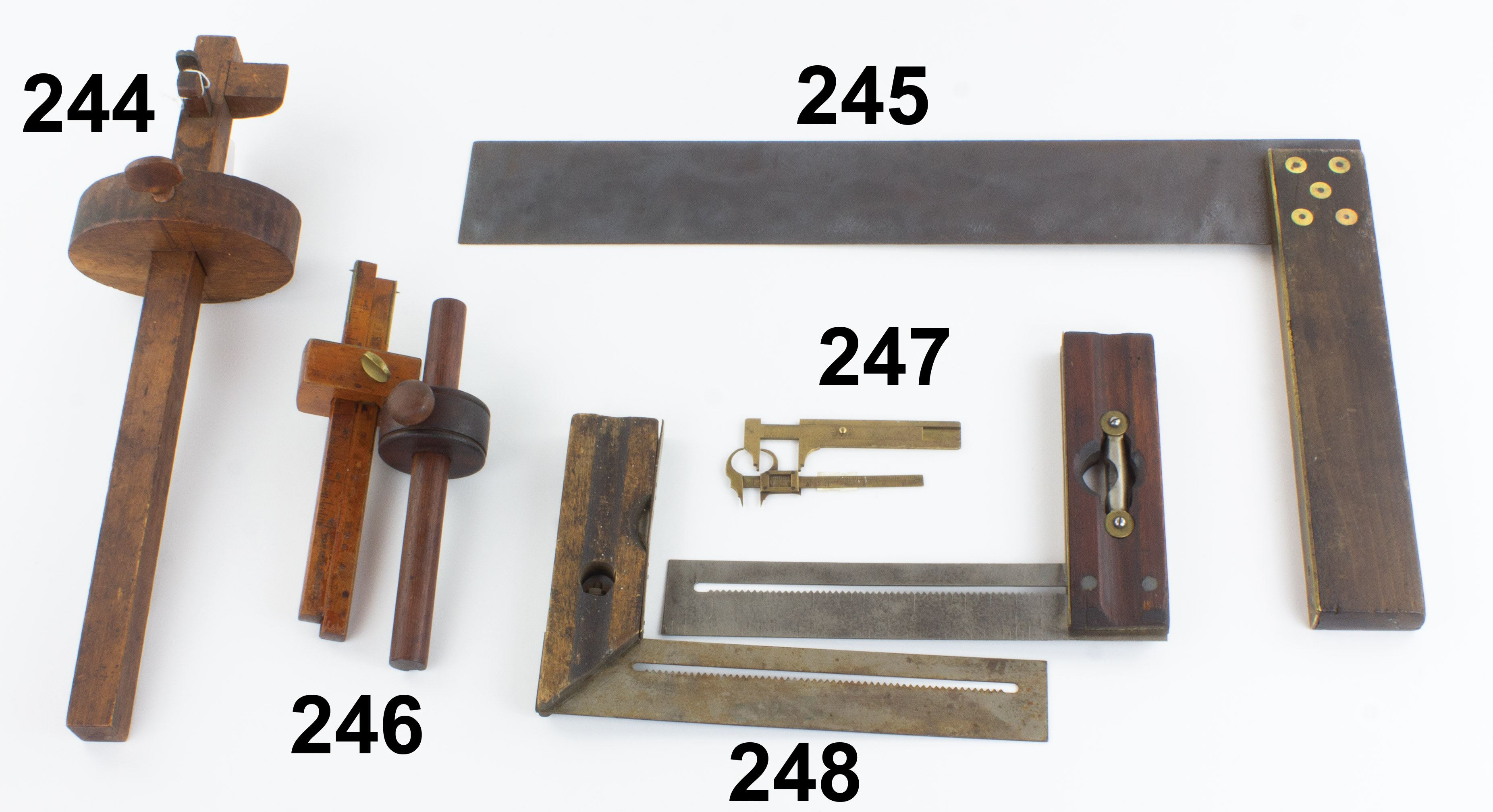 *7502-248 Lot of two try squares. Both have 8" blades and 7" handles with intact level vials. Blades have a notched slot for marking. Moderate wear to handles and some corrosion to blades. Both unmarked. Good (SKY294) 20-40