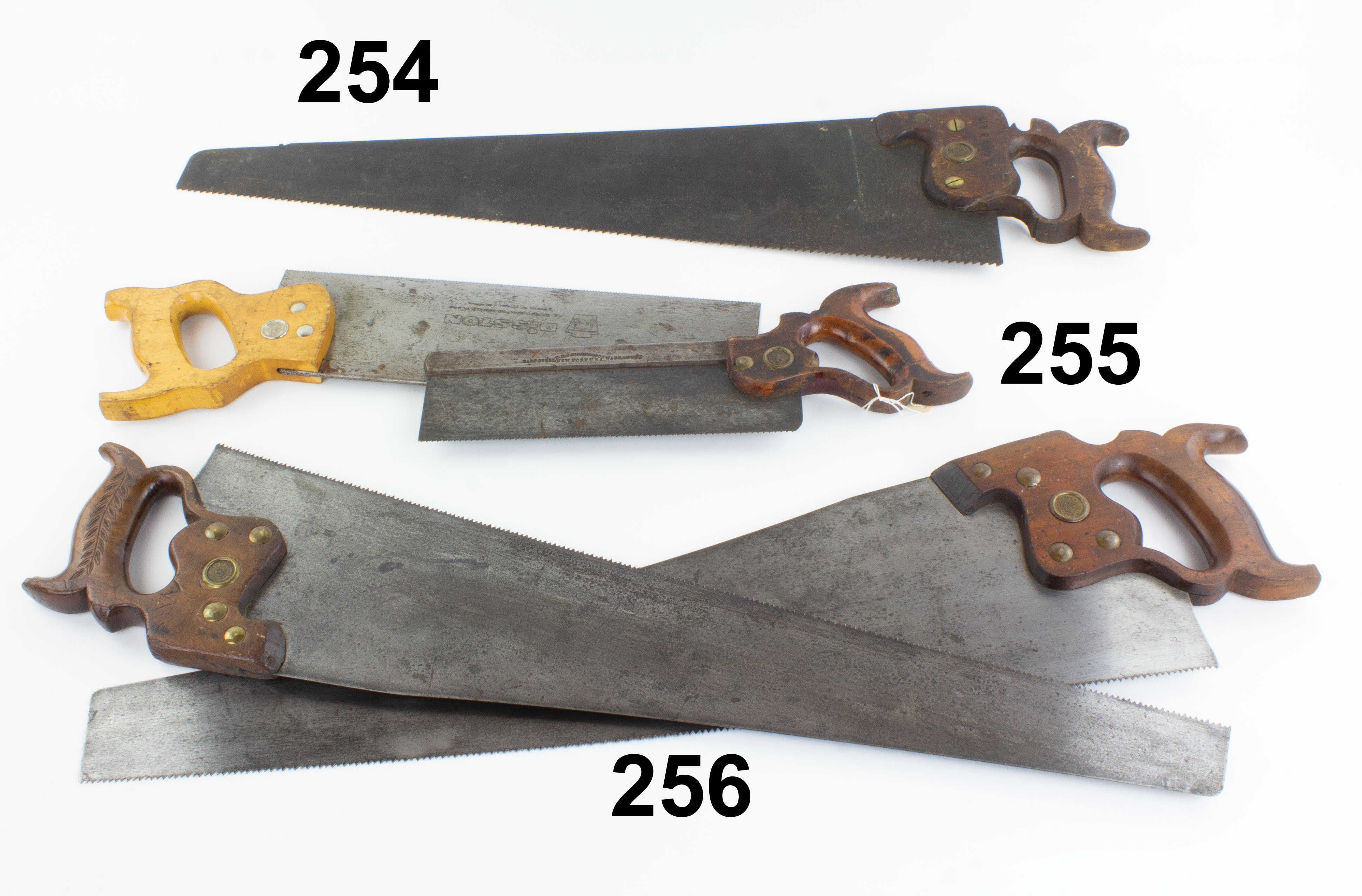7502-256 Lot of two DISSTON hand saws. One is a No. D8, 26" with 8 tpi, crosscut. Light wear on handle. The other has no visible etch but has Disston medallion, 26" blade ,10 tpi, crosscut. Handle has chip from upper horn and overall wear. Good & better (WBR114, WBR116) 30-60