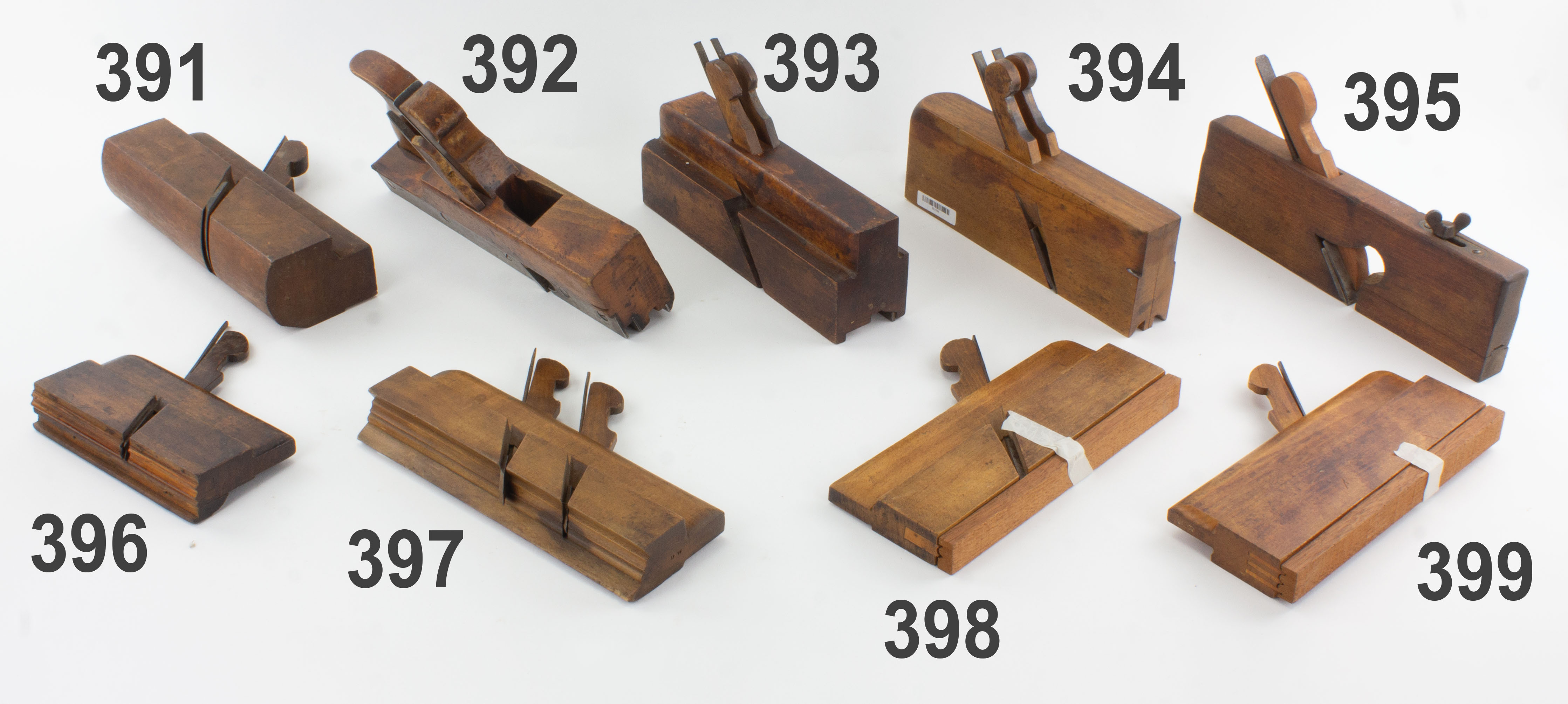 7502-395 User made rabbet plane with adjustable throat. 11" sole and 1" cutter. Sliding wooden piece locked by wing nut to adjust the throat. Wood oxidized with light wear, wedge might be replacement. Unusual. Good (BLY277) 30-60