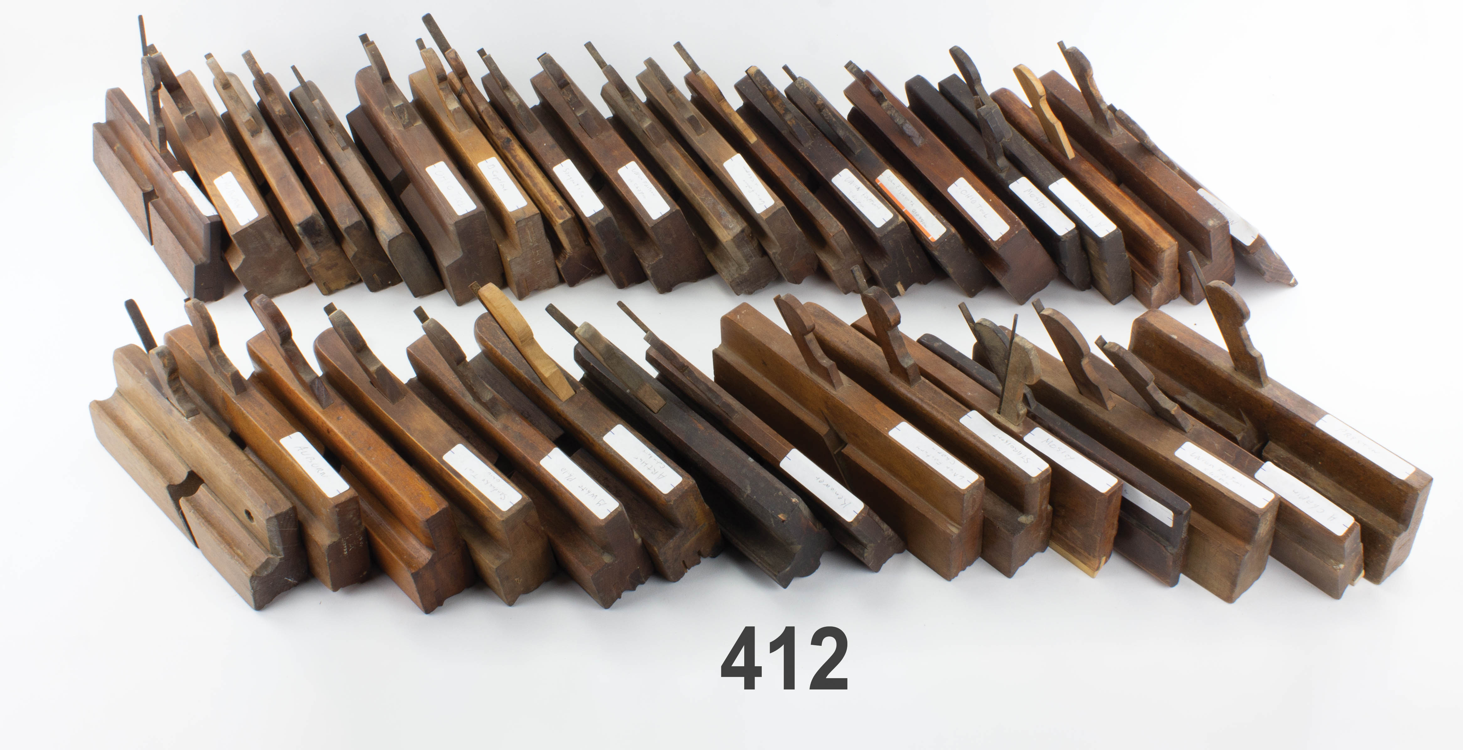 7502-412 Dealer's lot of molding planes. Thirty-six in total with various makers and profiles. Some with replacement wedges. As is, no returns. Various (PDN185) 100-200