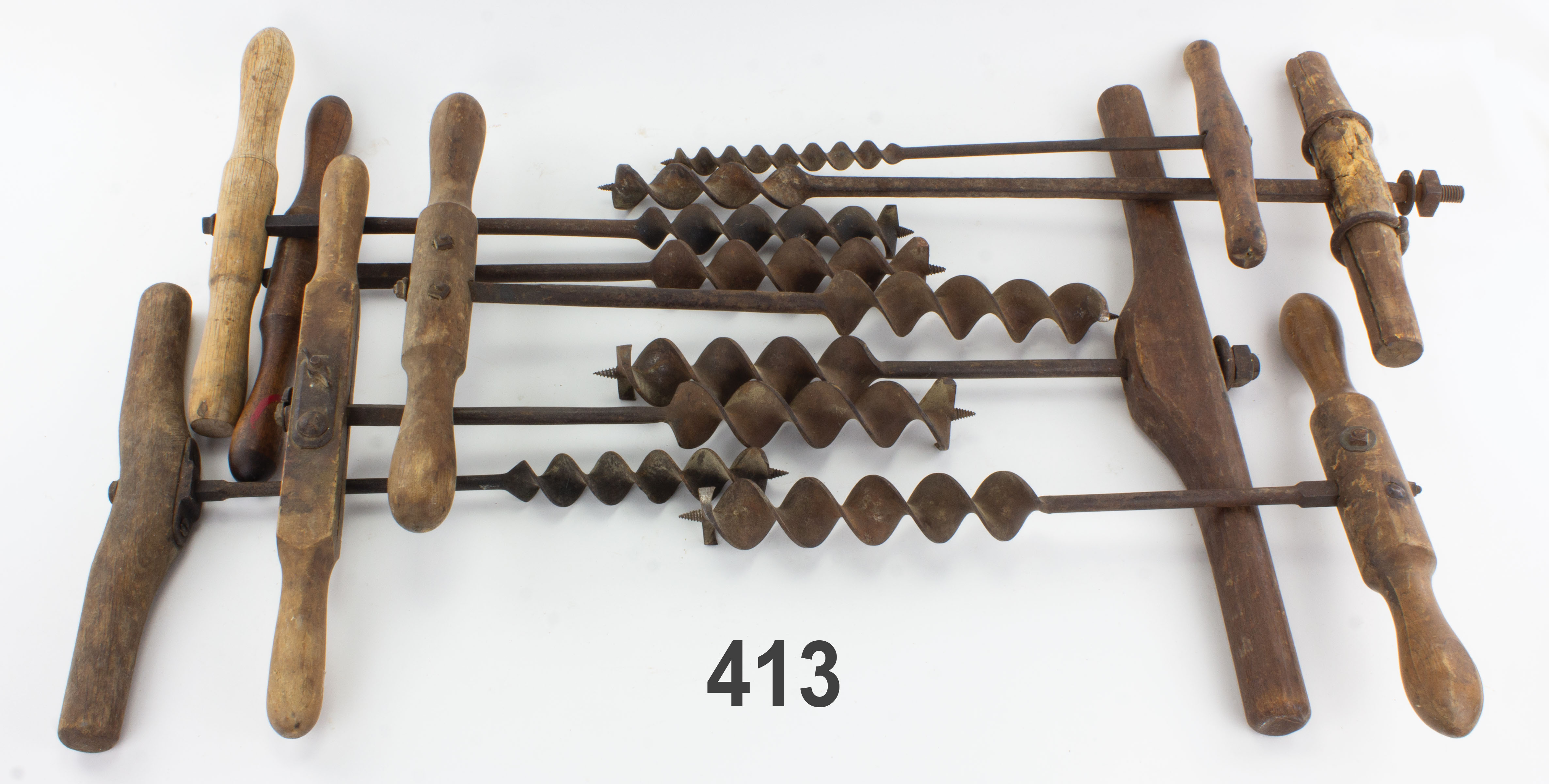 7502-413 Dealer's lot of t-handle augers. Nine total with various types of handles, spur auger bits are between 1" and 2" in widths. Most are rusty with some damage to wood handles, several look primitive or user made. From the collection of John Lervoog. Various (PBU506, 507, 509, 510, 511, 513, 514, 516) 50-100